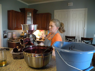 And then we started the jam making process the next day! We cooked the berries and then put them through a Squeezo machine (like a big sieve) to get the seeds out. Seedless blackberry jam is much tastier than that with seeds! Now we have many, many jars of jam to enjoy throughout the year. Mmmmmmm....